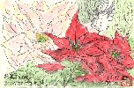 東京に住んでいる長男のお嫁さんが妻に贈ってくれたプレゼントです。この絵はポインセチアを中心に描いたものです。本物は鮮やかな深紅とピンクの花が添えてある緑の植物と調和して印象的ですが、ポインセチアは色が余りにも単一過ぎて絵にすることが難しいと思いました。なおポインセチアの赤やピンクの部分は苞葉で期間を経ると茎の下部の方から緑色に変わってきます。また花の中心部は人のくちびるに似た数ミリの横長状で非常に可愛いものです。長男夫婦には昨年5月に女の子が誕生し、現在では9ヶ月半になって伝い歩きが出来るまでに成長しました。 |