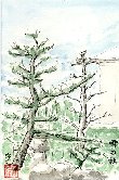 今年2度目の雪を自宅の庭で描いたものです。10cmほど降りましたが朝日で少し解けています。横に張り出している松の枝は雪の重みで垂れ下がってしまいますので、このような時には妻のアドバイスに従って雪を落とすことにしており、この絵も雪落としの前に描きました。今年は東京以北で大雪に見まわれましたが、こちらでは余り多くなかったものの近所の子供たちは雪だるまなどを作って楽しんだようです。 |