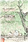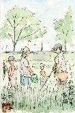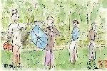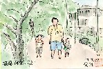 上の絵を描いたあとに五条川沿いで見かけた父と2人の子供さんです。私も30代にはこのように子供達を連れて虫取りなどに興じたものです。この時期はアブラゼミが活発に鳴き競っているので獲物には事欠きませんが、子供が無心でタモを振り回すのを見ると微笑ましさで気持ちが和みます。 |