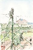 上に描いた「自然生態園」からの帰途、あまりにも妙な光景でしたのでスケッチしてみました。「ササゲ」の支柱の先端にこのように軍手がかぶせてあるのです。しっかりくくりつけてあるので多分かかしのつもりかと思いますが、それならば加害動物と被害を受ける作物は何か。この近くで数10羽の白鷺が田んぼに生息しているのを見かけましたので、これと関係があるかも知れません。軍手にすれば二度目のお勤めですが、効果があればちょっとした「リユース」のアイデアです。 |
