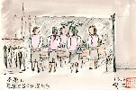 銀行員らしい数人の若い女性が洋傘屋の店先で日傘の品定めをしていました。最近は黒い日傘に人気が集まっているようで、どうやら2人が買った様子です。日傘で日光をさえぎる事ができてもこの猛暑から逃れることはできず、早々と退散しました。きっと冷房の効いたビルに逃げ込んだのでしょう。私もスケッチだけにとどめて足早に事務所に戻り着色した次第です。 |