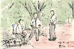 久しぶりの浜町公園での真昼の光景です。気温はおそらく35度を超えているでしょう。昼食を取り終えたらしいサラリーマンが木陰で雑談中ですが、中央の男性のカッターの襟が開いてネクタイもだらりと緩んでいます。この絵を描き終わった直後にさらに数人の男性がこのグループに加わり、しばらく話し込んでいました。みんな若く彼らの表情からは暑さに屈している様子は感じられませんでした。 |