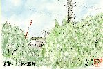 小牧市民病院の2階から見た光景です。実際の景色は窓にはめ込まれている枠で仕切られていますので、その区画のうち一番収まりのよい部分を描きました。木々の緑が濃く冷房の効いた病院の中からでも真夏の陽光が目に染みるほどでした。 |