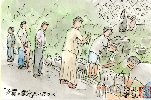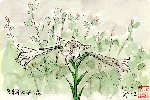 私の自宅から自転車で15分ほどにある「岩倉自然生態園」で見かけました。ここで描いたものを以前にもこのページで紹介していますが、夏にはこのように家族連れで来てセミやザリガニを取っています。この絵の手前にある細い葉はガマです。あまり広くない池の周りにガマが密生し、串に刺したウインナーに似た茶色い穂を見せています。夏休みもあと半月、しかも家族全員が楽しめるお盆もこの日が最後です。相当暑い中を、タオルで汗を拭きながら草むらを歩いている若い奥さんが印象的でした。