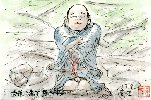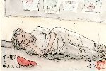 名古屋駅前地下街での光景です。昼寝を貪る浮浪者のそばの赤い野球帽が印象的でした。しかも帽子の方は着ているものと違って新品と思われます。このあたりは多くの通行人がいますが、浮浪者に関心を示す人は全くいません。そこで絵を描いている私のほうが奇異に映ったかも知れません。描き終わった丁度そのとき男は赤い帽子をかぶって立ち去りました。 |