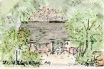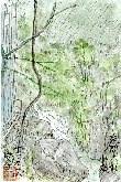 上の小滝を描いて数日後気がついて描いたのがこの絵です。この滝も高さ1.5m程ですが上の小滝とは形状が違ってこのようになだらかな傾斜を流れるものです。水量が多少多目のため滝壷?も上がっています。奥の院から境内間での滝はこれら3つのみですが、水自体は非常にきれいであるため、岩肌はもちろん滝壷の小石などもよく見えます。 |