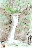 「迫間不動尊」は駐車場から徒歩で往復30分弱ですので、最近健康増進をかねて妻とよく参拝しています。このお不動様には奥の院があり、そこから数m離れたところが最上部で格好のよい高さ20m程の滝があります。このあたりは山が比較的深いためか水量は相当変化するものの切れたのを見たことがありません。この絵は奥の院から見たものです。一度信者がお経を唱えながらこの滝に打たれているのを見かけました。 |