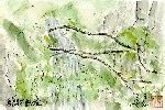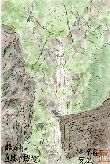 上でご覧頂いた滝の下流で、迫間不動尊への参道横下にある小さな滝です。高さはせいぜい1.5m程ですが、この絵を描いたときの水量は多からず少なからずで岩のでこぼこをぬって水が勢い良く流れる様子が良く見えます。また周囲の草木もこの絵のように面白い配置になっています。 |