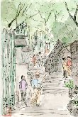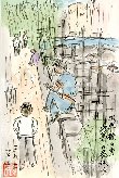 久しぶりに東京浅草橋付近で描きました。昼休み神田川の堤防に腰掛けて携帯電話をしている若者、その前を通過するサラリーマンなどまだ残暑を避けて日陰で自分の時間を過ごしているという感じです。この絵には表せなかったのですが神田川には屋形船が多く係留されていました。 |