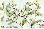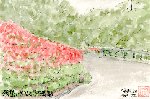 サルスベリは私にはあまりなじみのない花でしたが、実際には意外に多くの場所に植えられていることに気がつきました。私が頻繁にドライブする岐阜県関市郊外の山道は、若い木も含めて多くの花を観賞できました。この絵もその1枚です。花の色はこのようにピンクのほか赤紫・白に斑が入ったものなど種々ありますが、比較的細かい葉の緑と調和して地味ながら存在をアピールしています。 |