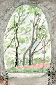 迫間地区の山腹に張り付くように細い車道が敷設され、ちょっとしたドライブウエイコースになっています。このトンネルはたった数10mの無名のトンネルで、この中で車の行き違いは出来ませんが、これが却って山中の雰囲気をかもしています。この絵はトンネル中央から東口を見たもので、出口にはこのように雑木林をバックにサルビアの花壇がこじんまりとしつらえてあります。以前ここを通った時抱いたイメージ通りの絵になりました。 |