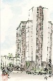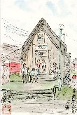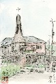 兵庫県相生にある石川島播磨重工業相生工場に出張したついでに描いたものの1枚です。この教会は相生駅から港に向かう途中にあり、幼稚園を併設したかなり大きな教会のようです。このロケット状の塔はこげ茶色の屋根と採光窓の取り合わせがユニークで、周囲に高い建物が少ないので結構目っています。 |