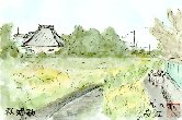 自宅から数kmのところにある一宮西高校近くで見かけた初秋の景色です。セイダカアワダチソウの黄色い花が小川をはさんで一面に広がり、はるか前方にはお寺らしい屋根がきりっとその存在を誇示している感じです。この絵の右側に駆け足している高校生を描き、「始動」の意味を効果的に表したつもりですが意図に反して目立ちませんでした。 |
