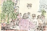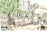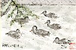 私が五条川沿いを歩いたのは数え切れませんが、このようにカモの遊泳を見たのは初めてです。20〜30羽のカモが水流に乗ったり逆らったりしてえさを探しているようでした。私も丁度絵の題材探しをしていたときで早速描くことが出来ました。周りの桜並木は紅葉に程遠く、葉の茂った枝が初秋の風に揺られながらカモを見下ろしているようです。 |