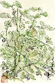 7月半ば庭の隅に自生したものを鉢に移して育てました。葉がセンナリホウズキに似ていたので、実が生るのを楽しみに肥料を入れたりして様子を見ていたところ、このように外袋をかぶらない直径数mmの表面が黒く光沢のある実をつけました。口に入れると少し甘味があり2・3個まとめて舌に載せるとちくっとする感じもします。植物図鑑で調べたら「アメリカイヌホウズキ」という植物だそうです。本当の「イヌホウズキ」は毒性植物とのことですが、これは実の表面に光沢がないのでその違いがはっきりしています。「イヌ」という名前通り実がどんどん増えて、今では鉢の周りが落ちた実だらけというありさまです。 |