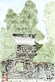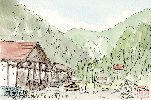 この建物は岐阜県板取村の「板取温泉」です。「温泉」ではちょっと無粋なのでスイスかオーストリアのどこかをイメージした場所として印象付けるため、しゃれた横文字名をつけたのかも知れません。この時期は紅葉までにはまだ間があり、温泉以外には目玉がないという場所であるため、訪れる観光客はまばらで駐車場もガラ空きでした。尤もこの村は「アジサイ」ではかなり有名で、私も以前アジサイの時期にここを訪れて何点かの葉書絵を描き、このページで紹介しています。 |