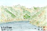 上の絵と逆方向を描いたものです。この日は秋空が高く晴れ上がり、遠くの山々まで見通すことができました。岩屋ダムの直下には出力288,000kWの馬瀬川第一発電所があり、第二ダムの下に66,400kWの第二発電所があります。岐阜県には中部電力が有する全水力発電設備の半分以上があり、いずれもこのような風光明媚な山間部に位置しています。現在ではすべての設備が遠隔制御による無人運転となっています。 |