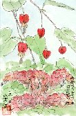 私の庭にある最もお気に入りのウキツリボクとコエビソウを、釣る側と釣られる側の名前の取り合わせとして描いてみました。実際はこのような配置にはなっていないので、ウキツリボクの愛らしい形とコエビソウのペロっと舌を出し(事実洋名でベロペロネという)人を食ったような形状との対比を面白く出したつもりです。ただいくつかのコエビソウを密着させて描いたので「エビ」が「カニ」のようになってしまったのは、やはりオワライです。 |
