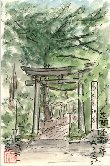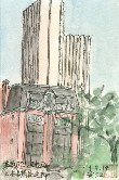 仕事上の最も関連深いNEDO(新エネルギー・産業技術総合開発機構)のフォーラムに出席したついでに、会場となったホテルを遠望して描いたものです。ホテルの縦じまで機械的な造形と手前の赤レンガからなるヨーロッパ風の建物との対照は、葉書絵の題材としては面白みがあります。また赤坂あたりは数え切れないほどの高層ビルが林立して特徴が無いので、このような景観に遭遇できるのは珍しいです。 |