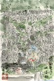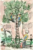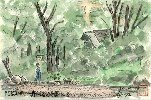 東京の都心で見かけた光景です。多分青桐だと思いますがすっかり葉の生い茂った樹木の枝が数人の作業員によって切り落とされていきます。この絵のモチーフは樹下に立って竹製の熊手を振りかざす男です。また描いている間に皆隣の樹に移動してしまい、後には切り落とされた枝が根元に積まれていました。 |