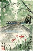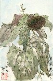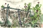 近くの畑で見かけた光景です。千成瓢箪の棚に接して朝顔の蔓が延びており、この絵を描いたのは夕方近かったのですが朝顔の一部の花はまだしぼむことなく、瓢箪に負けじと自己の存在をアピールしているかのようです。しかし初秋のこととて蔓や葉の方は茶色に変わってきており、10日ばかり後に通りがかった時には、これらは全部取り除かれていました。 |