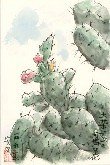 これは上の薬用植物園で描いた植物の絵3枚の内の1枚です。青空に向かって大きなサボテンが伸び上がり、その先にピンク色の花が子供のように乗っているという感じでした。サボテンの効用についての説明板がそばあったようですが、絵を描くのに夢中で読み忘れました。 |