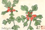 自宅のそばの道路わきで見かけたこの花は、非常に珍しく特徴があるので早速鉢植えにして描きました。、中央に可愛い花が集合し、周りは赤い苞葉(ほうよう)に囲まれています。赤い部分は葉の成長に伴ってこの絵のように緑に変わリます。この花はポインセチアと同じトウダイグサ科で、花の形状と苞葉(ほうよう)が変化するのも良く似ています。もともと北米南部が原産の帰化植物で、今では観賞用として栽培されているようです。お隣の家にはたくさん自生しておりますが名前がわからず、家の近くや東京の職場近くの花屋さんで聞いたり、図書館に足を運んで調べてもわからなかったので、庄内緑地公園(名古屋市内)を訪れて専門家に会い、その方の図鑑でやっと見つけることが出来ました。今回この花を知った喜び以外に、花に関係している人達に共通した親切な態度(必ず後日電話で何らかの回答をしてくれた)に感激しました。 |