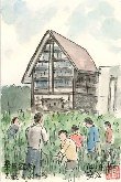 ここは岐阜県川島町にある「内藤記念くすり博物館」での光景です。この博物館は大手薬品メーカーであるエーザイ鰍フ創業者・内藤豊治氏が1971年に日本で初めての薬に関する総合資料館として開設されたもので、この絵のよう展示室などの建物と薬用植物園があります。薬に関する収蔵資料約5万点のほか、薬用植物園には600種を超える薬草や薬木が栽培されているそうです。私がここを訪れた時には何組かのグループがこのように直接植物に触れて説明を受け、中には植物をもらっている人もいました。 |