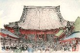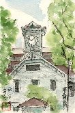 「時計台の鐘が鳴る・・・」、かっては周囲の建造物が少なく、時計台と鐘の音が遠くからも感じられたでしょうが、現在では高層ビルなどに囲まれて正面にある銀行入口付近からのみ、このように見ることが出来ます。この絵を描いたのが午前10時過ぎで、行き交う観光客が時計台をバックに相手を立たせ思い思いにカメラを向けていました。私が葉書絵を始めて丁度9年、全国のかなり多くの題材にチャレンジしてきましたが、この時計台は私の長年の希望をかなえてくれたモチーフの一つになりました。 |