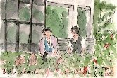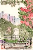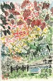 上の絵を描いた公園ではこのような場面も眼にしました。2人の茶髪の女性をモデルにしてスナップ写真を撮っています。花壇のベンチにすったモデルの前でカメラマンがいろいろ注文をつけているようです。周囲には濃淡の緑に囲まれたいろいろな花が咲き乱れ、カメラマンの創作意欲をくすぐっているのかも知れません。 |