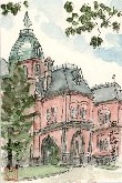 北海道庁に隣接して残されているこの旧庁舎は、明治21年(1884年)に建造された当時は鹿鳴館と並ぶ大建築物であったそうです。昭和44年(1969年)国の重要文化財に指定され、現在は観光の目玉として多くの人たちを集めているようです。青緑色の屋根を冠したレンガ造りの建物には明治の風格と現代の落ち着いた感じがうまくマッチし、私の葉書絵の中に素直に入ってきました。 |