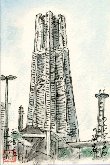 横浜港のシンボルであるこの建物については、数年前横浜港西側の外人墓地から遠望して描いたことがあるだけで、接近して描いたのは初めてです。あまりにも幾何学的な造形で冷たささえ感じさせますが、一般のビルのように単純な形状でないために、よく観察すると光の当たり方で表情が変わりおそらく長く見ていても飽きないのではないかと思った次第です。そういえば数年前に訪れたアメリカのピッツバーグ近くの地方都市に、これとよく似た名前も同じランドマークタワーがあったことを思い出しました。 |