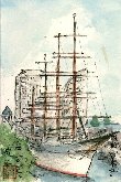 東京からの帰途新横浜で新幹線に乗り換えるには間があったので、横浜港近くに来て昼食を取ったついでに描きました。この船は文部省が航海練習のために1930年建造した帆船で、現在は横浜港に係留されています。秋の澄み切った空をバックに、黄色いマストが端正ともいえる姿を表しています。すでに引退して久しいので帆を張ることはないでしょうが、帆を全開して航海したこの船の姿はさぞかし美しくロマンを感じさせたのであろうと思います。 |
