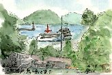上に描いた場所から北方向を見ると、湾を挟んで瀬戸内海に浮かぶ島々が眼に入ります。向かって左側が女木島(鬼ヶ島)、その右手奥が男木島だそうです。丁度遊覧船が港近くに入ってきました。船が不相応に大きく見えるのは視界が樹木に挟まれているためですが、秋の太陽が海の色をいっそう鮮やかにし、船を目立たせている感じもします。手前は城の水門で、この城が海城であるためお堀の水位を潮の干満にあわせて調節する目的で設けられたものだそうです。 |