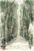 大学の正門から標識に従ってキャンパス内を歩くこと約30分、ポプラ並木にたどり着いて驚いたのは、あまりにも樹齢が重なっている様子です。しかもその貫禄?に私は圧倒される思いでした。入口の注意書きに「倒れる危険があるので近寄らないように」と表示してあるのも印象的でした。早速絵具などを出して描き始め、出来がったのがこれです。10年ほど前観光バスで通りすがりに見た並木はもっと若い感じがしましたが、樹木も人間と同様晩年の外見の変化が長年生きることの厳しさを象徴しているようです。 |