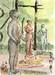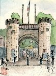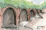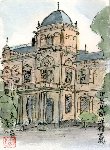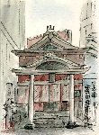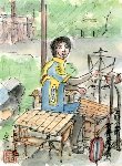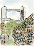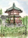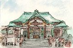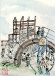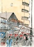 | このページで過去11月15日の掲載が3回ありそれぞれ印象的なページにしていますが、最近は私の行動半径が縮小してきたためか、葉書絵のモチーフにもある種のパターン化が目だってきました。そこで今回は残暑と紅葉の狭間における人たちの営みや、その営みの結果として目に見える事象を描いてみました。特に今年は私の長男夫婦の長女(私にとって初孫娘)が3才になったので、東京の亀戸天神社に七五三参りをし、初めてこのお宮さんに来たのを機会に描いたのが今回の目玉です。 |