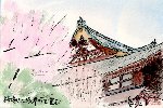 3月下旬の東京は例年より半月ほど早く春が訪れ、あちこちの桜は満開です。この絵は昼休みを利用して出かけた上野公園での様子を描いたものです。平日の昼間というのに公園の桜並木の間には多くの花見客がひしめきながら歩いていました。上野公園では和風寺院建築は珍しく、桜に囲まれたこの清水観音堂にも多くの人が集まっているようです。