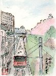 総武線飯田橋駅と並行して走っている中央快速電車を駅から土手の桜と対比させて描きました。電車の「動」に対するこじんまりした桜の「静」を表現したつもりです。電車が、桜の淡い色と土手の緑が告げている春の静けさを劈くように走り抜けていきます。またこれと並行して総武線の黄色い電車も走っていますが、タイミングよく描くことは出来ませんでした。