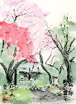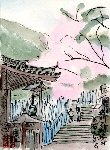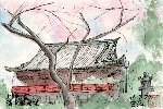 隅田川公園の桜がきれいだとのうわさを耳にし、さっそく出向いて何枚か描きました。ここはあまり広い公園ではないですが、このように花桃と桜が隣接した場所を見つけました。両方の花の色がうまく調和してアクセントをつけている感じです。そのはるか向こうに牛嶋神社というお宮さんがあり、ここも良いモチーフだったので1枚描きました。