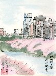牛込橋は神田川にかかり、神楽坂を下った所にあります。この絵は上流側の市ヶ谷か四谷方面にあるビル群をバックにして、川岸に張り付くように咲いた桜を描いたものです。ビル群の冷たいイメージ・桜の温かみ・神田川の穏やかな流れを組み合わせて表現して見ました。神田川にはこの他かなり多くの場所で同様の風景を目にすることが出来ます。