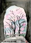 ドライブでひんぱんに通る長さ100mほどのトンネルは、入口(南)側と出口(北)側で全く景色が異なります。これは入口側を中から見たもので、入口が満開の桜で蓋されているような感じです。以前出口側を中から見た絵も描きましたが、この時は夏でサルビアが真っ赤な花をつけていました。