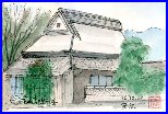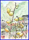 「姫路場内庭園・紅葉僅かに残る」:(2004.12.6) 建造物を描くのに、落葉樹が生い茂っているときより枝だけになった時期のほうが適していると思うことがあります。この絵は枝だけになりすぎた光景ですが、落ちるのを惜しんで枝にすがりついた葉も、枝だけの殺風景になるのを防ぎ、遠方の城のモチーフを目立たせるには効果があるように思います。 城の周りはいずれこもほとんど落葉し、イチョウだけが黄色い葉を残していました。