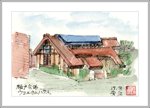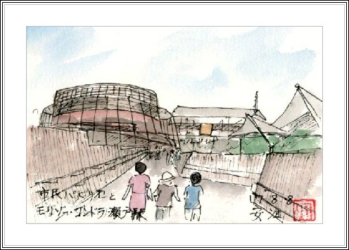 | 市民パビリオンは瀬戸会場の中心的な施設で、ここでは市民が企画・運営する種々のプロジェクトが実行されている。円柱型の木造建物を通路がらせん状に取り巻き、そこからは海上の森が見渡せる。この絵は東ゲートとの連絡路から描いた。モリゾーゴンドラ瀬戸駅は市民パビリオンの3階(最頂部)とつながっているが、万博の最終時期には長久手会場に向かう客で1時間以上待たされる。 | ウエルカムハウスは瀬戸会場の玄関口にあたる、東ゲート正面に設置され、海上の森の自然とその大切さなどを紹介している。この和風建物の屋根は多分杉皮であろうか。また建物に隣接して小さな池がありメダカが泳ぐのをのを親子が真剣に観察していた。すべての物がが自然と我々との関わりをさりげなく示し、自然のありがたさを教えてくれる。 |