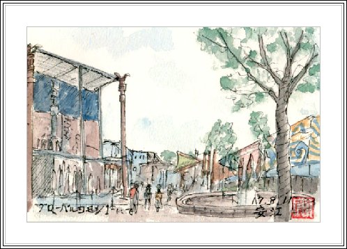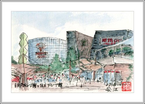| 愛知万博の企業パビリオン9個所のうち最も人気があるのがこの2つである。日立グループ館へは7月はじめに事前予約で入り、絶滅危機にある動物の紹介などが気に入ったので8月中旬に一番電車で会場に駆けつけ長時間待って入りなおした。トヨタパビリオンも一番電車で入場しうまく入場できた。ロボットの細かい動きには目を見張るが、人間とのコンビネーションによるパフォーマンスもすばらしかった。万博後半での待ち時間はいずれも4・5時間以上とのこと。 | グローバルコモン1はアジア各国のパビリオンが並び、この絵はその入り口部分で左の建物はイランパビリオン、右側は中央アジア共同館である。この絵を描いたのは朝早かったので観客は少ないが、9月に入ってからは黒山の人だかりが日常である。グローバルコモン1の奥まったところに韓国館、その手前に中国館がある。韓国館の民族舞踊を堪能したほか、中国館も2度入り若い女性による伝統音楽の演奏も楽しめた。 |