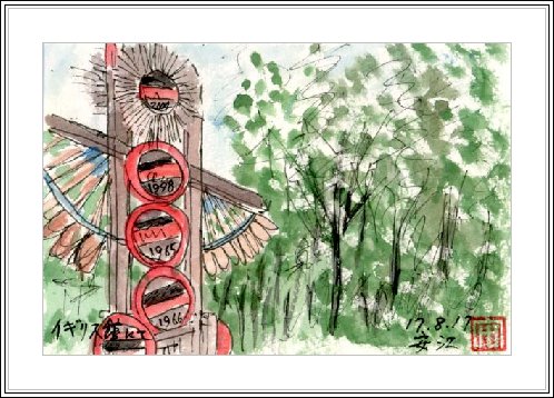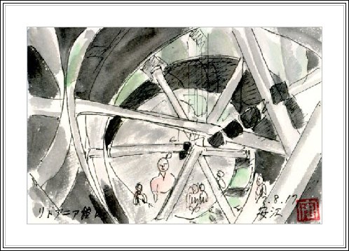 | リトアニア館は他のパビリオンには見られない奇抜な展示を行っている。らせん状に配置した非常に大きなテープ(DNAを表しているとのこと)をスクリーンにし、そこにたくさんの投影機で映画を上映している。観客はそれぞれの映像をゆっくり眺めることもなく、そのテープをまたいだり潜ったりして移動していた。 | イギリス館の庭園に置かれたモニュメントです。パビリオン内部にはカエルの手足の指をヒントに開発された粘着テープなどが展示されているが全体も比較的地味で、大国にしては印象が薄いと感じた。庭園の植物に関心があったのでアテンダントに質問したところ、全部こちらで調達したとのことである。 |