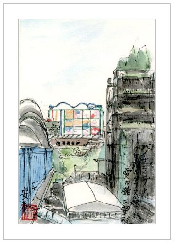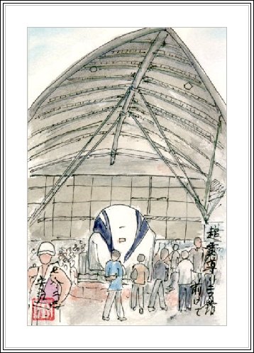 | バイオラングの裏側とグローバルハウスとの間から見た電力館である。このアングルはあまり目立たないが、描きやすい構図なので取り上げた。バイオラングの壁面は表側に比べて植物が減っていることがわかった。却って電力館が両側の地味な構築物にはさまれて引き立っている感じである。 | JR東海自慢の新技術を駆使して完成した超電導リニアモーターカーの実物である。この中には試験走行中のモニター画面しか置いていないが、後方建物では3Dシアターの上映と超電導ラボで詳しい実演を見せてくれる。試験状況の3D映像は迫力があるが、そこに映し出される技術者たちの表情が気に入った。 |