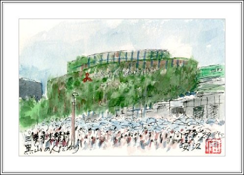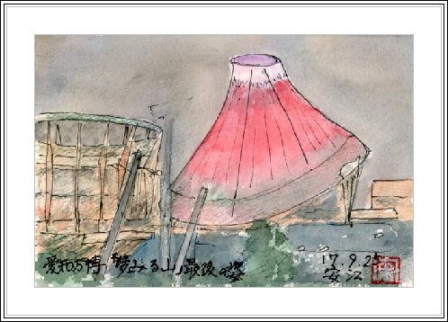 | 企業パビリオンの大部分は前回のページで紹介し、三菱未来館だけが残った。8月末に描いたが壁の植物は実際にはこのように生い茂っていなかった。私がこのパビリオンに入ったのは7月上旬でこの時でも45分ほど待ったが、この絵を描いた日は待ち時間1.5時間以上の表示が出ていた。「もしも月が無かったら」という今まで考えたことも無いこのテーマは確かに良い狙いであった。 | 最終日のこの日の夜私は愛知万博を脳裏に焼き付けるため、約1時間かけて全部の外国パビリオンの前まで巡回した。閉館は早いところでは午後6時半頃、人気があるところはまだ延々と人の列が続いていた。私はこの日、「夢みる山」で上演中の「めざめの方舟」を予約できて5時から入館した。2度目である。それを記念することも考え、この赤富士をイメージした「夢みる山」を作品に残した。 |
