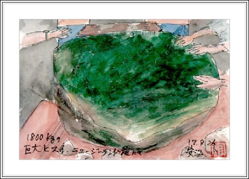 | ニュージーランド館へは2度入ったが、ここではこの巨大ヒスイ以外の記憶は無い。人の手と比べればその大きさは想像できよう。石が放つ濃い緑は威厳さえ感じるが、これにじかに触れることが出来るのも素晴らしいことだと思う。この絵の上から水が流されているが、何かの意味があるのだろう。1回目の入館で1.8トンと記憶していたので、2回目入ったときにアテンダントの現地女性に1.8トンですねと確かめたところ、1800kgですとの返事が返ってきた。この返事の意味は?。またこのヒスイは本国へ帰ったのだろうか。 |