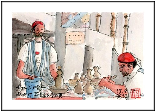 若い職人が熱心に小さな花瓶をロクロをまわして製作している。周りには客が取り巻いて買った商品に自分の名前を刻んでもらっていた。2人ともあごひげ(実際はこのように濃くは無かったが)をはやし人懐っこい感じであった。客あしらいもうまいらしく、客の笑い声も聞こえている。別の場所でここの花瓶を持ち歩いている人を見かけた。装身具などと違ってどこにでもあるという代物ではなさそうである。 |
