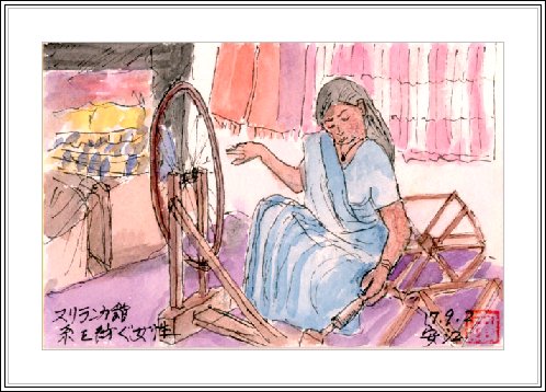 スリランカは昨年暮れの大津波で甚大な被害をこうむった国として記憶も新らしい。このパビリオンでは2人の女性が糸紡ぎと機織りの実演を行っており、機織りの絵も描いてある。背景の織物は現地の産物であろう。この絵の左側のプーリーが自転車の輪を利用しているのがミソ。まさにリユースの実践そのものである。手作業による糸紡ぎや機織りを現在わが国では見ることが出来ないであろうが、私の子供時代には祖母がやっていたことを記憶している。 |